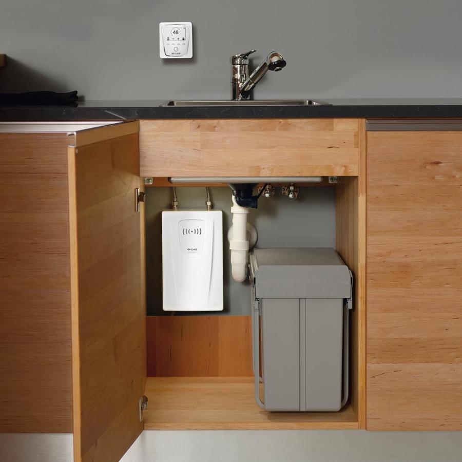 Удобным и энергоэффективным решением для обеспечения кухни горячей водой является проточный водонагреватель E-compact CFX-U. Компактный прибор устанавливается под кухонной раковиной для экономии места, практичный пульт дистанционного управления позволяет удобно регулировать температуру нагрева воды проточным водонагревателем. Установив нужную температуру нагрева воды Вы избегаете её смешения с холодной и тем самым уменьшаете теплопотери и экономите электроэнергию.